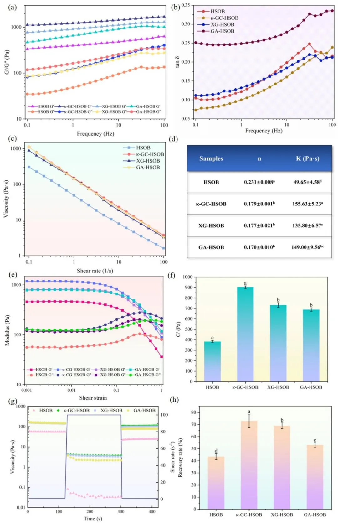 图 4 不同热改性芝麻油体基油墨的流变学特性。(a) 频率扫描;(b) 损耗角正切值;(c、d) 黏度行为;(e) 振幅扫描;(f) 线性黏弹区的储能模量 G';(g) 三段触变性测试;(h) 触变恢复率。字母 a~c 表示组间存在显著差异(p<0.05)。