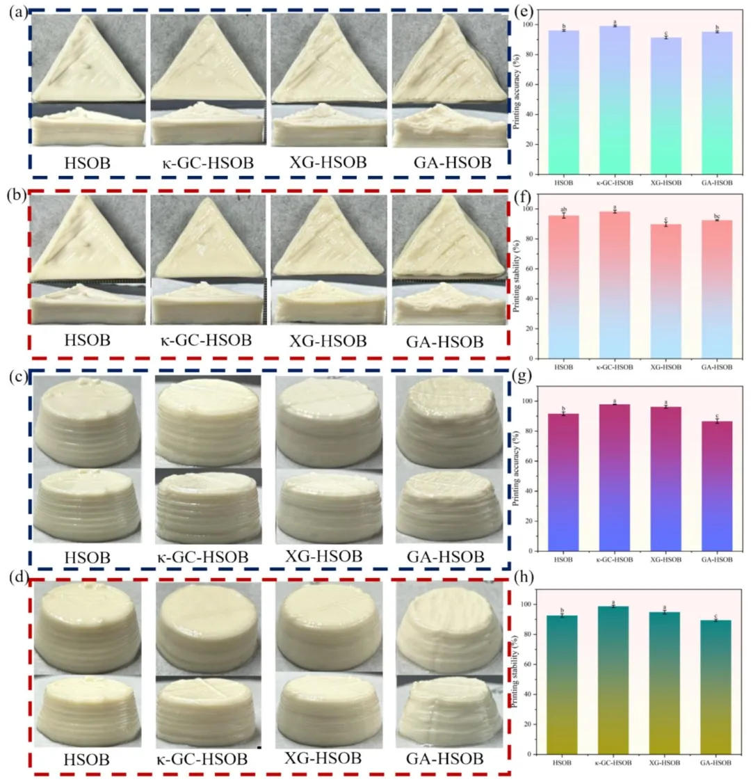 图 5 不同热改性芝麻油体基油墨的 3D 打印性能。(a、b) 打印 0 分钟和 60 分钟的三角棱柱制品;(c、d) 打印 0 分钟和 60 分钟的圆柱制品;(e) 打印精度;(f) 打印稳定性。字母 a~c 表示组间存在显著差异(p<0.05)。