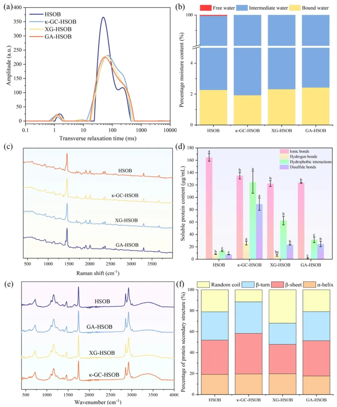 图 6 表征分子间相互作用的微观指标。(a) 低场核磁共振图谱;(b) 水分类型分布;(c) 拉曼光谱;(d) 化学作用力;(e) 傅里叶变换红外光谱;(f) 蛋白质二级结构。字母 a~c 表示组间存在显著差异(p<0.05)。