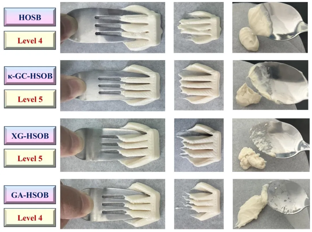 图 7 不同多糖改性热改性芝麻油体油墨的国际吞咽障碍饮食标准化倡议(IDDSI)分级测试结果。