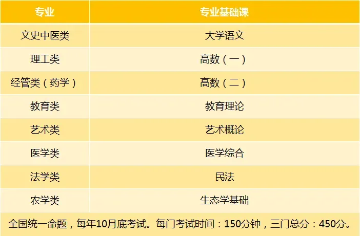 文史中医类 | 政治、英语、大学语文 | 法学类 | 政治、英语、民法 | |