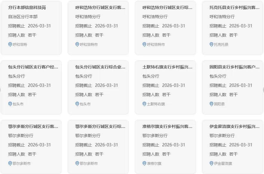 中国农业银行内蒙古自治区分行是中国农业银行股份有限公司辖属一级分行,深入践行金融工作的政治性和人民性,以高质量党建引领高质量发展,立足服务乡村振兴领军银行、服务实体经济主力银行定位,全面实施“三农”普惠、绿色金融、数字经营三大战略,聚焦金融“五篇大文章”,全力支持内蒙古完成好习近平总书记赋予内蒙古的五大重要战略定位和任务使命,服务保障“模范自治区”高质量发展,为谱写中国式现代化内蒙古新篇章贡献农行力量。现面向境内外高校招聘优秀大学毕业生,有关招聘事宜公告如下: