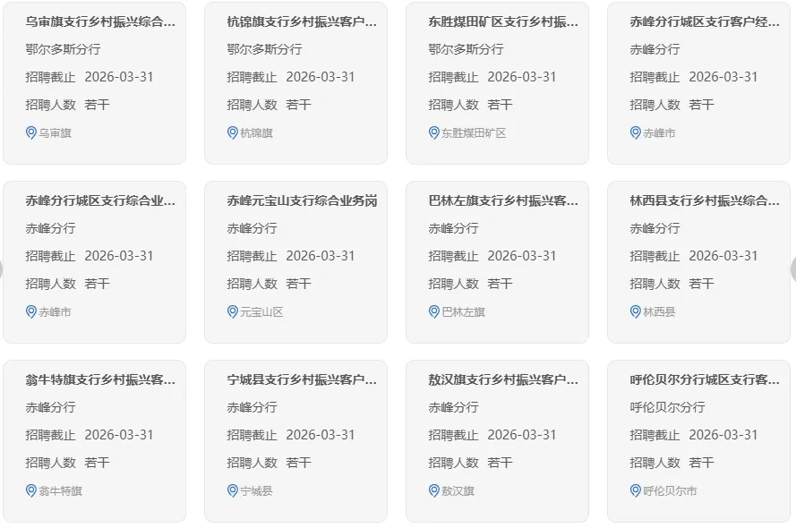 各岗位的工作职责、应聘条件和具体要求见中国农业银行招聘网站(https://career.abchina.com.cn)岗位详情。