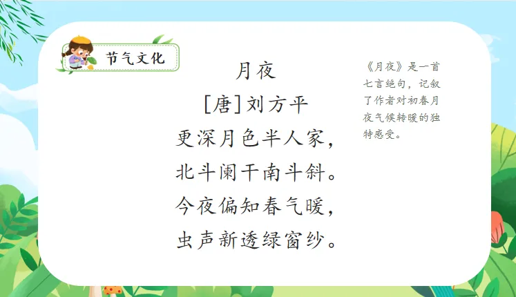 随后,王老师以一首刘方平的《月夜》,带我们穿越回古诗中的春夜。