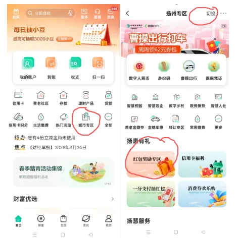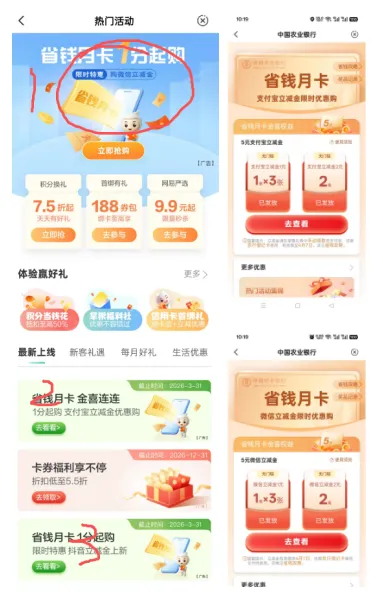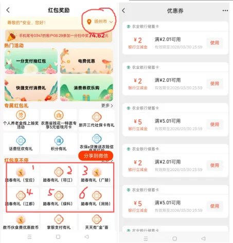 羊毛里最耐撸毛的就是农行和工行,大家一定及时办卡。路过就办一张储蓄Ka。如果办理信用Ka可私信联系我,还有额外现金或者礼品。1.全国农行立减金(WX0.1买5元,zfb0.5买5元,)。路径:首页-点中间的“热门活动”首页-城市专区-右上角切换扬州-点红包奖励-再右上角切扬州。这六个都可以付1分钱领取。每天9点,每月1次(没有名额就设个闹钟!养成设闹钟的爱好)https://u.jd.com/caz98EI (电子E卡,光大买100-10,识别二维码购买)