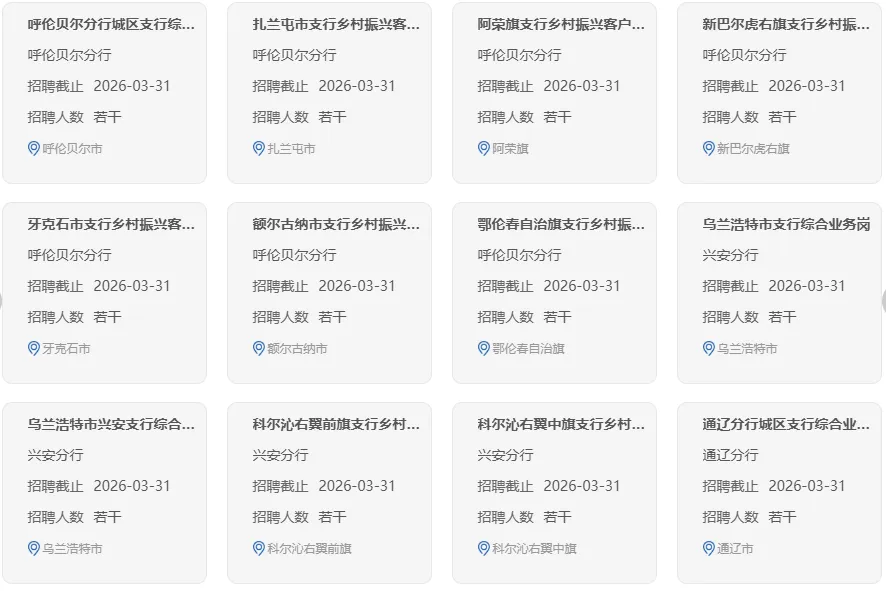 各岗位的工作职责、应聘条件和具体要求见中国农业银行招聘网站(https://career.abchina.com.cn)岗位详情。