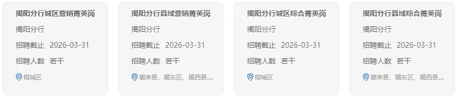农行广东分行立足改革开放前沿阵地,深刻把握金融工作的政治性和人民性,坚守服务乡村振兴领军银行和服务实体经济主力银行两大定位,突出做好金融“五篇大文章”,全力支持制造业当家、百县千镇万村高质量发展工程、绿美广东生态建设等区域发展战略,以更加优质高效的金融服务在中国式现代化广东实践中积极贡献农行力量。农行广东分行始终秉持“以人为本、人才强行”的人力资源理念,不断为员工拓宽价值提升空间,创造可持续发展路径,搭建施展才华的广阔舞台,不断提升员工获得感、幸福感和安全感。现正式启动2026年度春季招聘,诚邀有理想、有抱负、有激情的青年人才,与我们携手同行、共创辉煌!主要为我行培养和储备战略性业务骨干、经营管理人才。录用人员入职后一般先安排到支行或营业网点进行为期2年的培养锻炼。包括城区营销菁英岗、城区综合菁英岗和广州城区客服经理岗。主要为我行城区机构培养和储备零售、对公金融营销服务人才,财富管理、投行资管、国际金融、绿色金融、业务运营、信息科技、财务会计、风险控制、法律合规等专业或管理型人才。包括县域营销菁英岗和县域综合菁英岗。主要为我行县域机构培养和储备零售、对公金融营销服务人才,绿色金融、业务运营、信息科技、财务会计、风险控制、法律合规等专业或管理型人才。1.主要面向境内外院校2025年、2026年大学本科及以上学历毕业生,并应在2026年7月31日前毕业。其中,境内院校毕业生应取得毕业证、学位证,境外院校毕业生应取得毕业证及国家教育部留学服务中心的学历学位认证书。2.品行端正,诚实守信;遵纪守法,无违法违纪或不良行为记录。3.身心健康;具备良好的综合素质;具有较强的学习适应能力和团队协作精神。5.符合监管机构关于银行业从业人员的有关要求,以及中国农业银行亲属回避相关规定。各岗位的工作职责、应聘条件和具体要求见中国农业银行招聘网站(https://career.abchina.com.cn)岗位详情。欢迎和鼓励原建档立卡脱贫户家庭大学生应聘我行各类岗位。1.报名方式:应聘者请登录公众号回复文字“0324”即可获得在线注册、填写简历并投报岗位。每名应聘者最多可投报两个岗位。点击公众号,回复文字“0324”即可获得报名入口等1.应聘者对所提供信息及资料的真实性负责。如与事实不符,我行有权取消其考试和录用资格,解除相关协议约定。2.中国农业银行招聘网站(https://career.abchina.com.cn)及“中国农业银行人才招聘”微信公众号是我行发布各项招聘安排的官方渠道,其他渠道均未获得我行授权或许可。3.我行招聘为公开招聘,无任何形式的内推;不指定考试辅导用书,不举办也不委托任何机构举办考试辅导培训班。我行从未向任何机构提供过校园招聘考试相关的资料和信息。请广大应聘者提高警惕,谨防上当受骗。4.招聘期间,我行将通过农行招聘网站站内信和手机短信等方式与应聘者联系,请确保准确填写联系方式并保持通讯畅通。5.岗位投报成功后,如需修改已投递岗位的简历信息,请修改“个人中心”—“我的简历”内容,并在“我的投递”中取消申请后重新投报。如仅修改“我的简历”,不会同步更新已投递岗位的简历信息。6.中国农业银行有权根据岗位需求变化及报名情况等因素,调整、取消或终止个别岗位的招聘工作,并在法律允许范围内对本次招聘享有最终解释权。7.咨询方式:gdnhzp@abchina.com.cn。