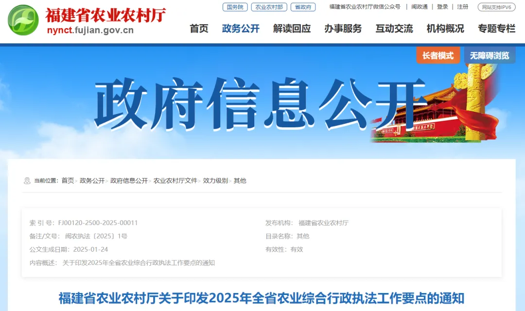 福建省农业农村厅关于印发2025年全省农业综合行政执法工作要点的通知