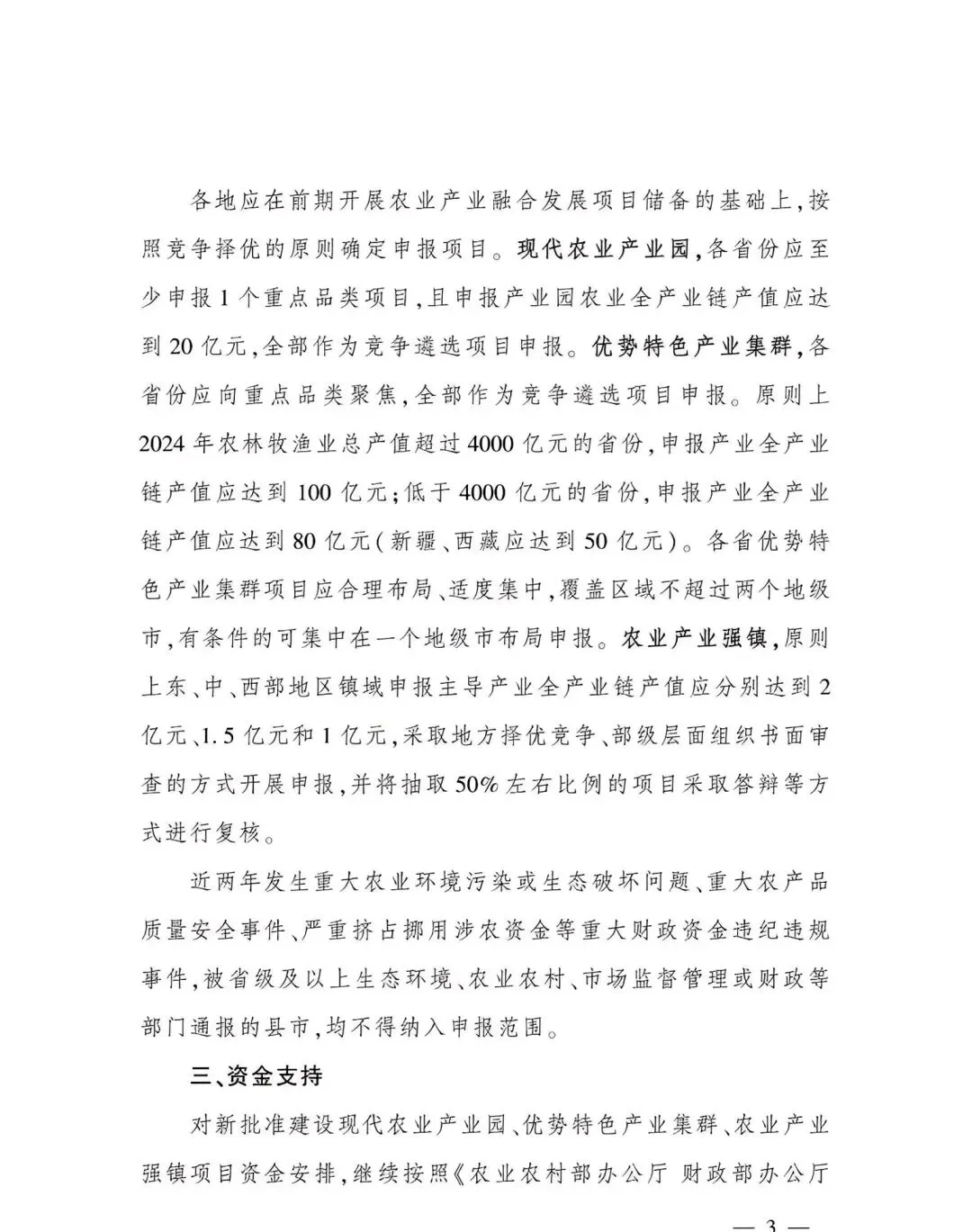 首先是产值硬杠杠,没有商量的余地:现代农业产业园,全产业链产值必须达到20亿元,各省至少要报1个重点品类项目,而且全部走竞争遴选,不是报了就有份;优势特色产业集群,2024年农林牧渔总产值超4000亿元的省份,全产业链产值要做到100亿元,低于4000亿的省份要80亿元,新疆、西藏放宽到50亿元,而且覆盖区域不能超过两个地级市,鼓励集中布局;农业产业强镇,东、中、西部的主导产业全产业链产值门槛,分别是2亿元、1.5亿元、1亿元,而且今年明确了,要抽取50%左右的项目现场答辩复核,不是报上去就万事大吉,真刀真枪的比拼在后头。
