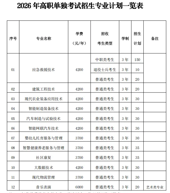 2026年学校单独考试招生专业12个,计划500人(具体招生专业及计划见附件),仅应急救援技术专业招收中职类考生。学校视报考情况,分专业招生计划可根据实际情况进行调整。