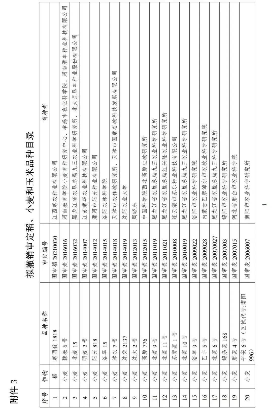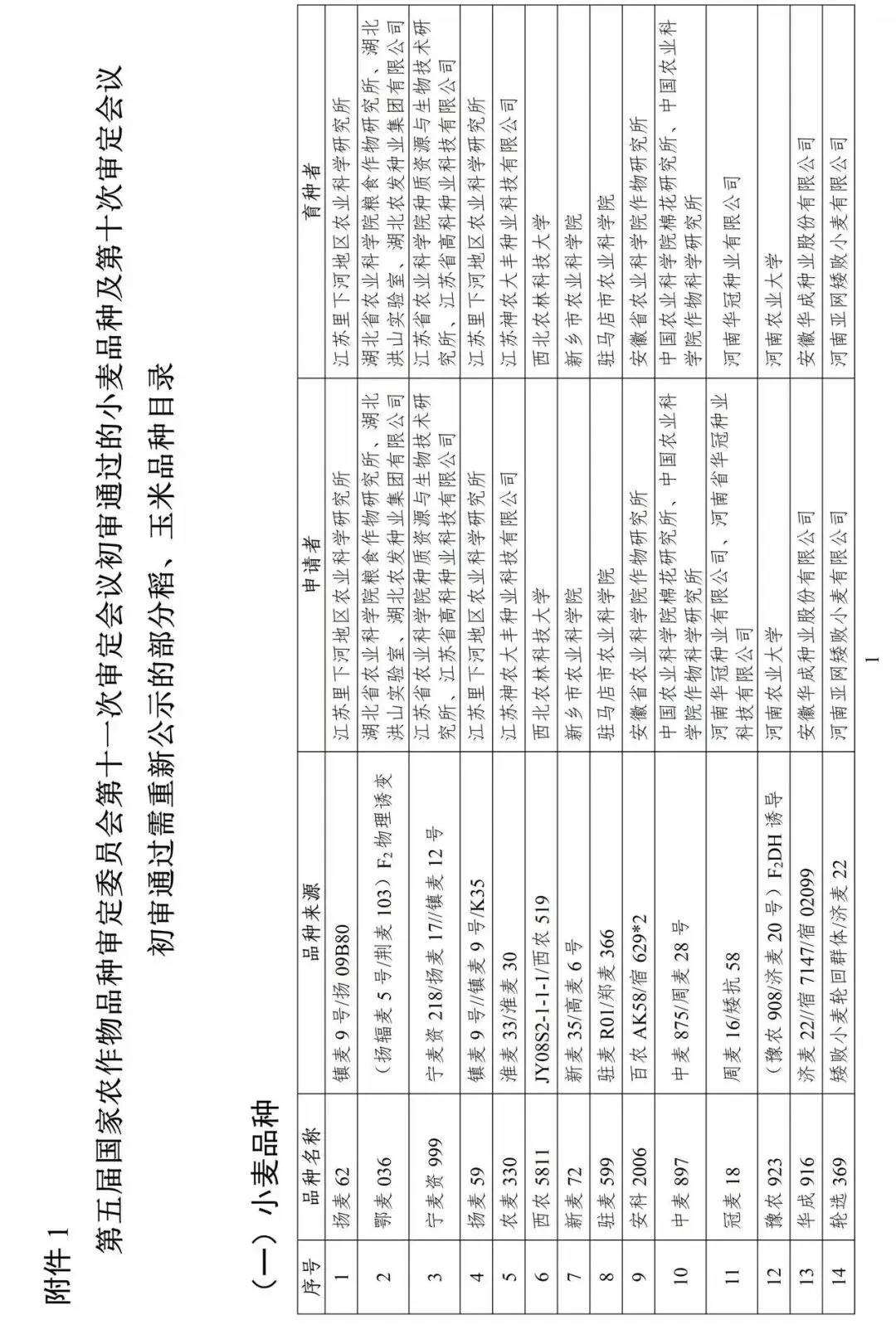 根据《主要农作物品种审定办法》、《农业植物新品种命名规定》和《国家农作物品种审定委员会章程(试行)》,现将第五届国家农作物品种审定委员会第十一次审定会议初审通过的小麦品种、第十次审定会议初审通过需重新公示的部分稻玉米品种及拟撤销审定的水稻、小麦品种相关信息予以公示,公示期为30日(自2026年3月20日至2026年4月19日)。