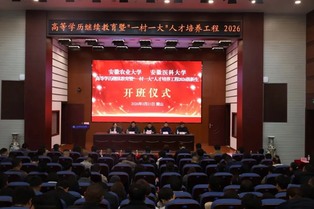 3月21日,安徽农业大学、安徽医科大学黄山教学点2026级高等学历继续教育暨“一村一大”人才培养工程开班仪式在图书馆4楼报告厅举行。市委组织部副部长汪朝军出席并讲话;黄山职业技术学院副校长汪家龙,安徽农业大学乡村振兴学院副院长徐峰,安徽医科大学继续教育学院副院长吴红艳分别致辞;继续教育中心主任佟永云主持。