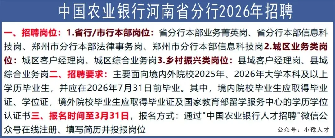 >中国农业银行河南省分行2026年招聘【至3.31】