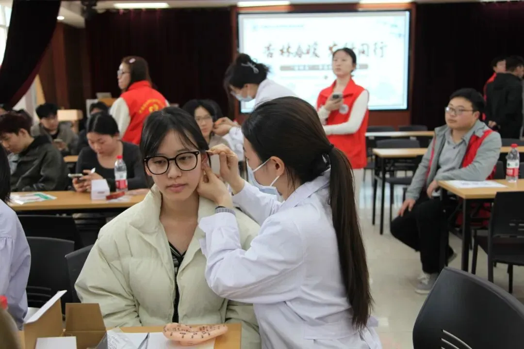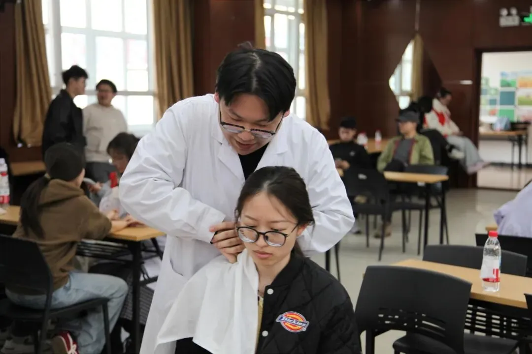 考虑到长期的实验及科研学习给同学们的颈椎带来了极大的负担,我院志愿者开展了经络推拿和肩颈放松服务,平均接诊50人次;同时,对于同学们中普遍存在的科研压力、睡眠障碍、用眼过度等亚健康状态,针对性使用耳穴压豆进行了理疗。