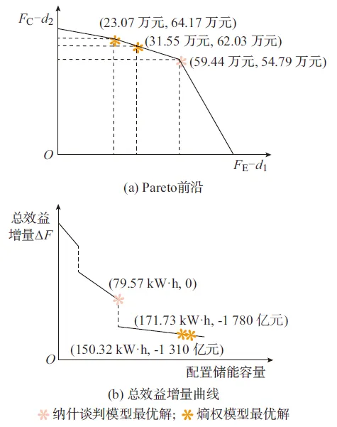 图4 储能配置策略的Pareto前沿及总效益增量曲线