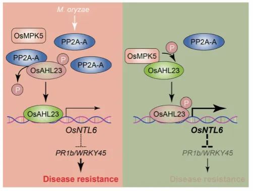 PP2A-A和OsMPK5调控OsAHL23磷酸化开关维持水稻免疫平衡的模式图