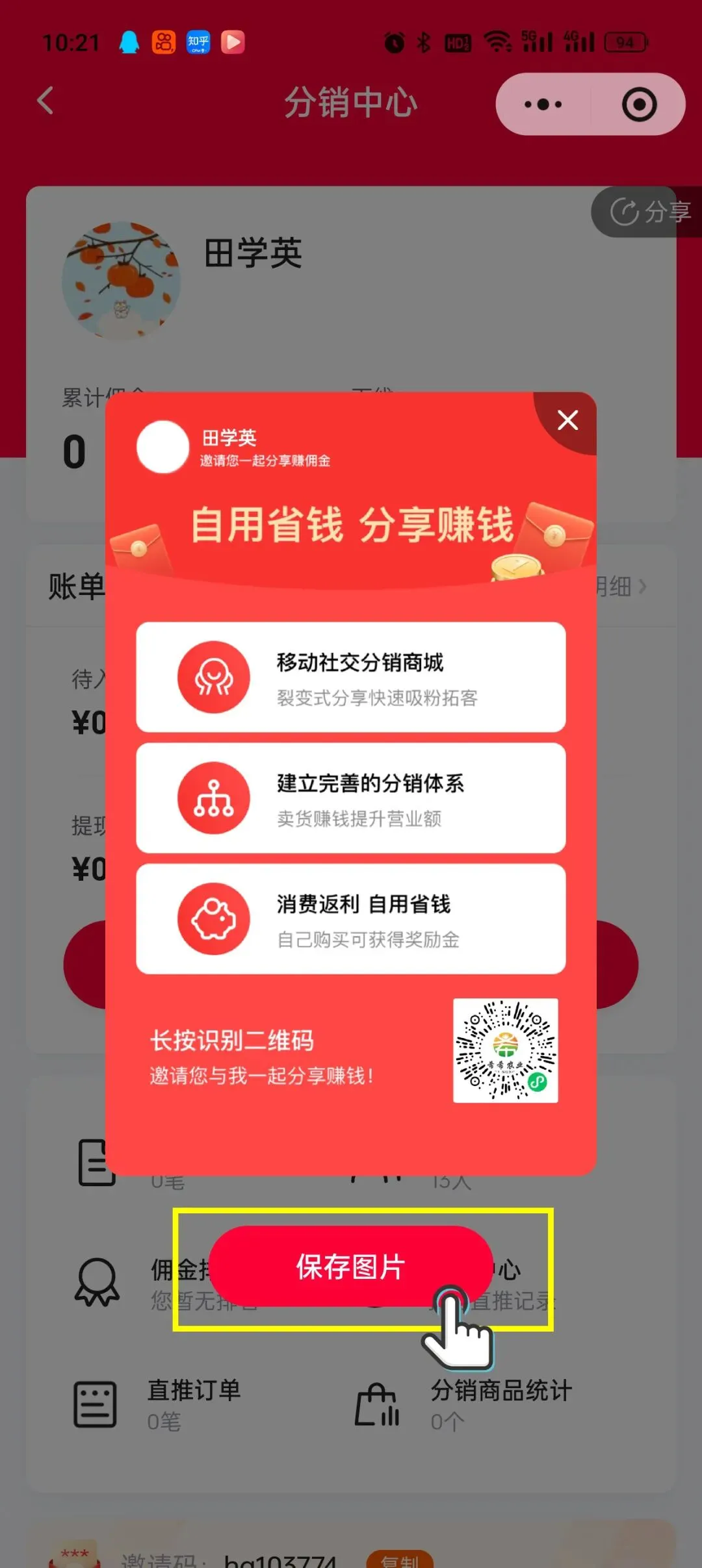 第2步:点“生成我的推广海报”系统自动给你做一张带二维码的图,上面有你的专属ID,谁扫都算你的!