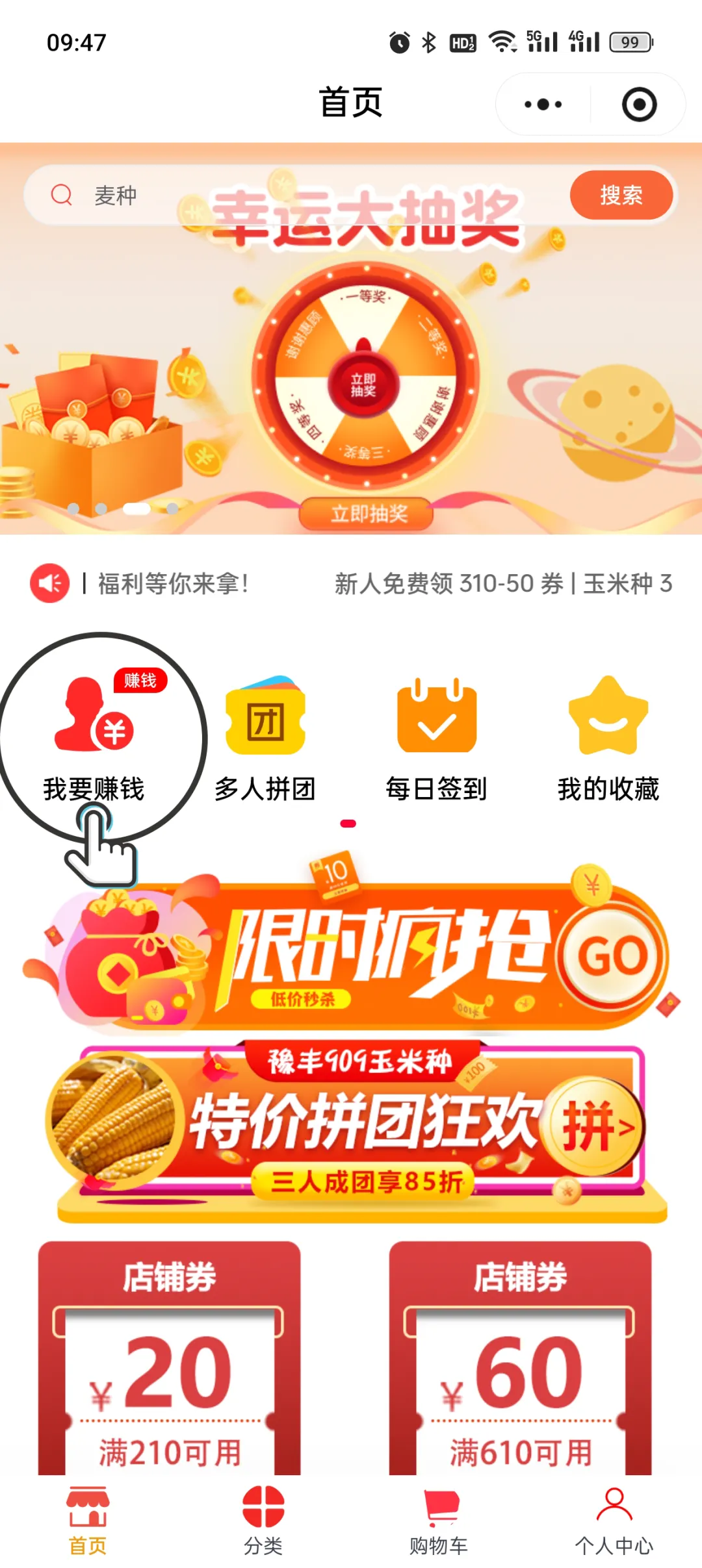第1步:打开希希农业小程序 → 点首页“我要赚钱”(就在首页显眼位置,红底白字,一眼看到)
