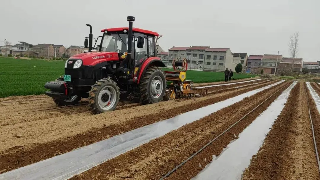 田寺村大型播种机实现春耕玉米开沟、播种、施肥、覆膜四道工序一气呵成