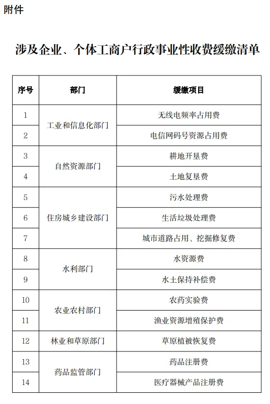 二、《涉及企业、个体工商户行政事业性收费缓缴清单》包括耕地开垦费、污水处理费等14项收费(具体项目见附件)。