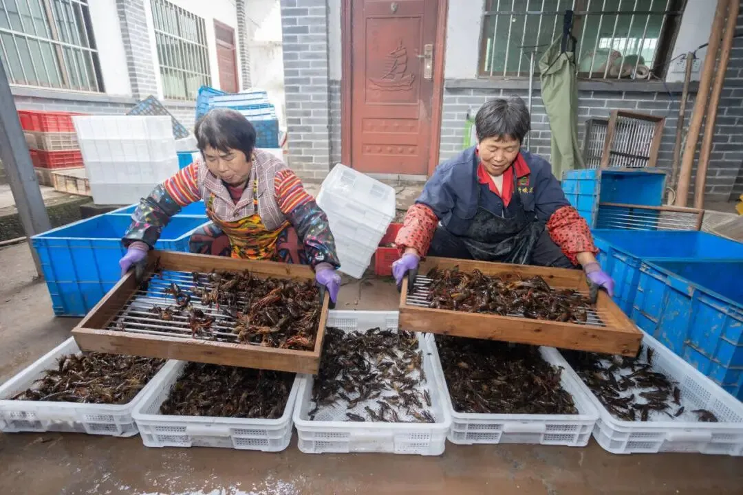 工人在给捕捞后的小龙虾装箱
