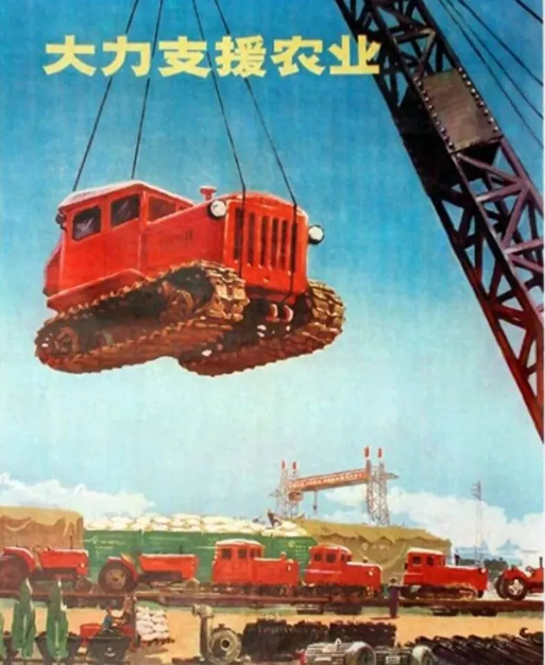 画面里,耕地机械运抵农村,塔吊吊装农机设备,工人们齐心协力,以工业力量大力支援农业,助力农业生产技术提升。