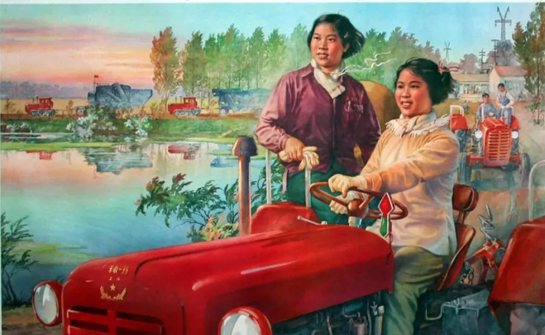 池塘旁的道路上,生产队迎来了拖拉机队伍。领头的拖拉机上,一位女驾驶员带着副手,神情兴奋喜悦,农机队伍开进乡村,全力支援农业发展。