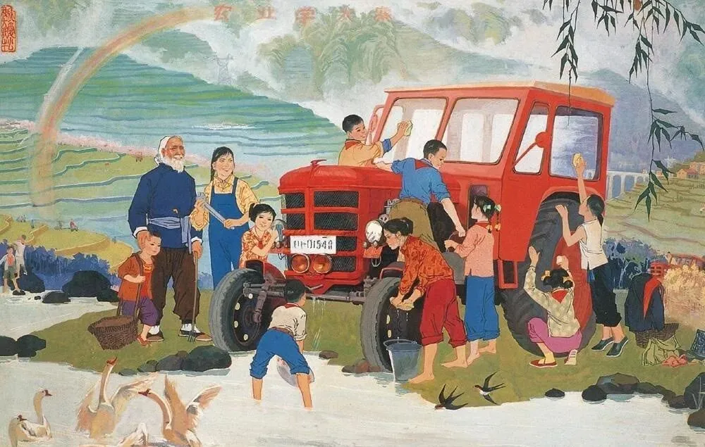 “大铁牛” 指的就是拖拉机。画面中,公社的拖拉机停在梯田旁,孩子们开心地擦洗拖拉机,旁边还有几只大白鹅相伴,场景生动鲜活,尽显那个年代的振奋与喜气。