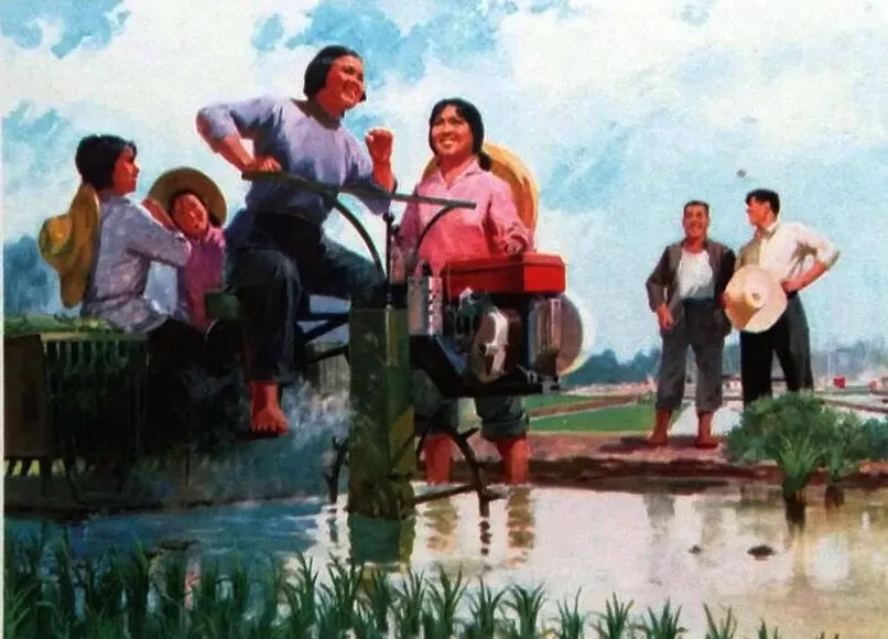 春耕插秧时节,生产队引进了插秧机,女社员们驾驶着插秧机在田间作业,脸上满是喜悦,展现出机械化种田的新气象。