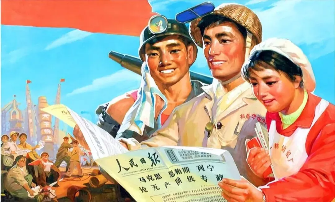 画面中,不同工种的工人们在工作间隙,一同翻阅人民日报,关心国家大事,体现出劳动者心系国家、积极向上的精神面貌。