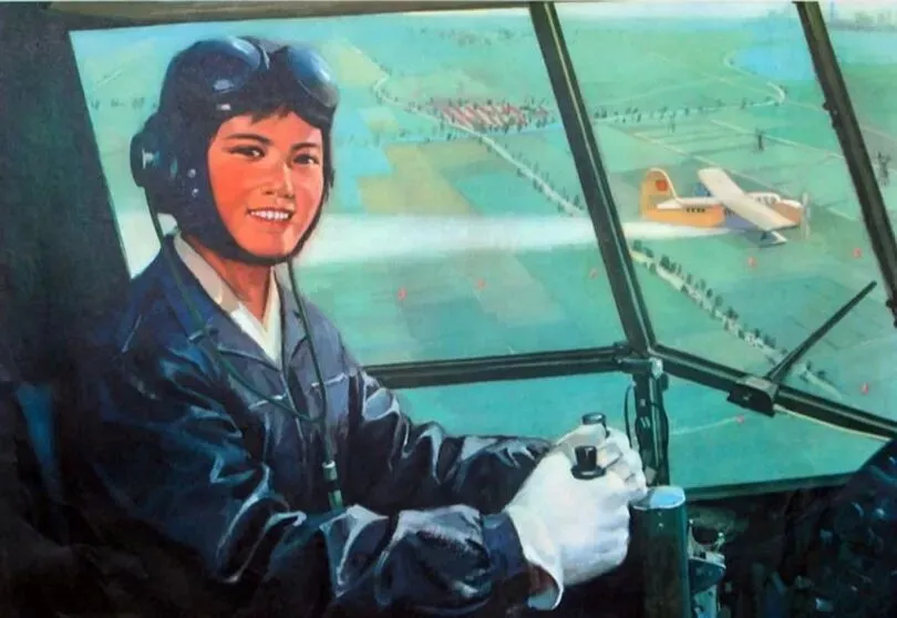 画面里,女飞行员驾驶飞机在稻田上空作业,进行航空施肥或农药喷洒,用现代化方式支援农业生产。