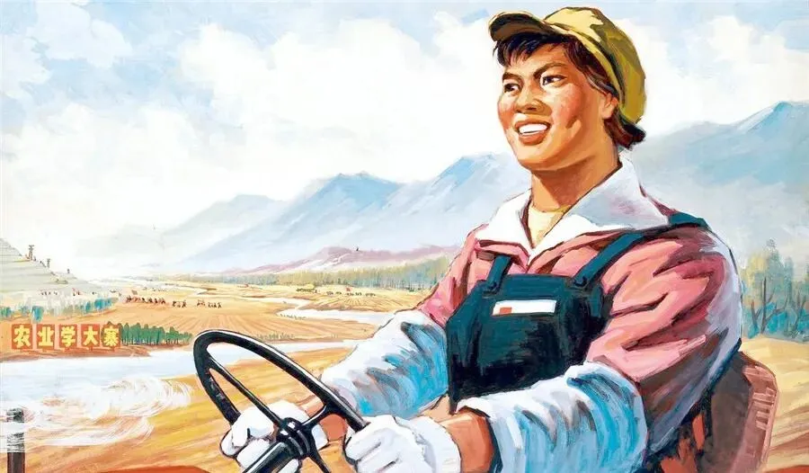 女驾驶员开着拖拉机在田间耕作,响应 “农业学大寨” 号召,开荒生产、建设家园。
