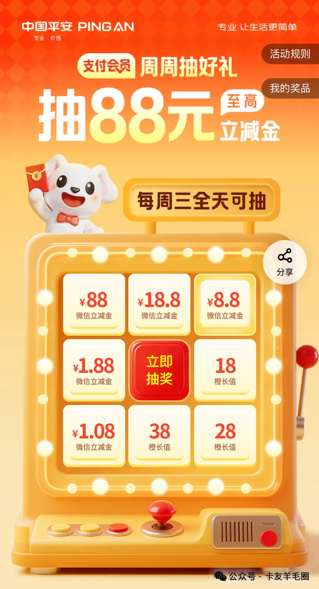 活动内容:活动期间,客户可进入本活动页面参与“支付会员周周抽好礼”活动,每周可获得1次抽奖机会,可在每周三0点至24点期间进行抽奖,奖品包含:28个会员橙长值、38个会员橙长值,1.08元微信立减金、1.88元微信立减金、8.88元微信立减金、18.88元微信立减金、88.88元微信立减金、口袋商城优惠券(清风敦煌抽纸3包4元券、北大荒非转基因大豆油5L装20元券、可口可乐6瓶10元券)。奖品合计每周限量125,251份,数量有限:领完即止。