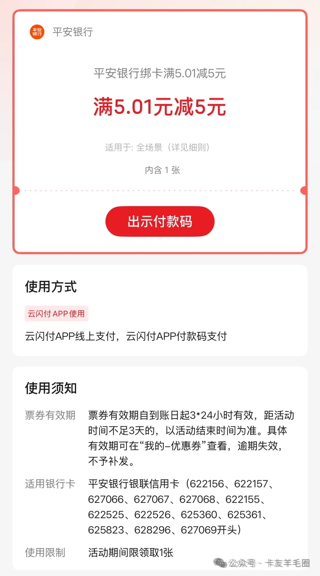 活动内容:活动期间,用户通过云闪付APP新增绑定平安银行银联信用卡 可自动获得1张5元立减券,用户可用平安银行信用卡在下笔“云闪付消费交易”中支付满5.01元使用。单用户(按身份证号限制)限获得1张券。