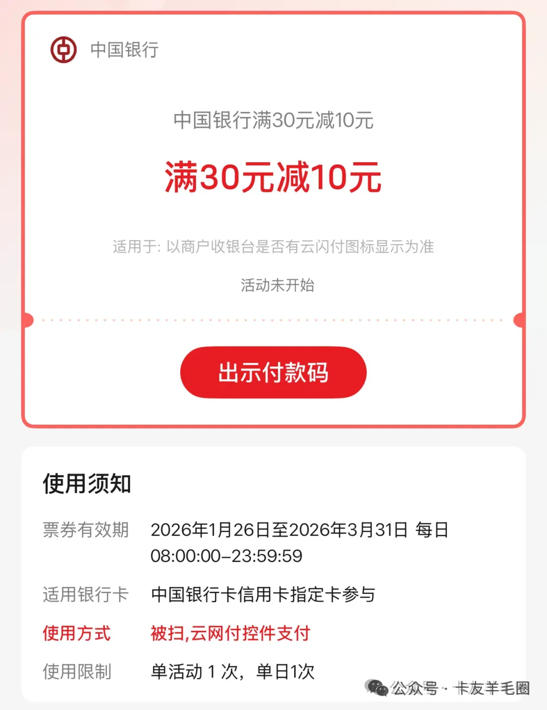 活动内容:活动期间,客户使用62开头的中行银联信用卡至可受理商户出示中国银行APP银联二维码付款码完成被扫支付,可在中国银行APP完成首笔交易时有机会享受满30元减10元优惠单客户活动期间限享1次优惠,活动期间每日名额2,450个参与方式一:使用中国银行APP银联二维码支付