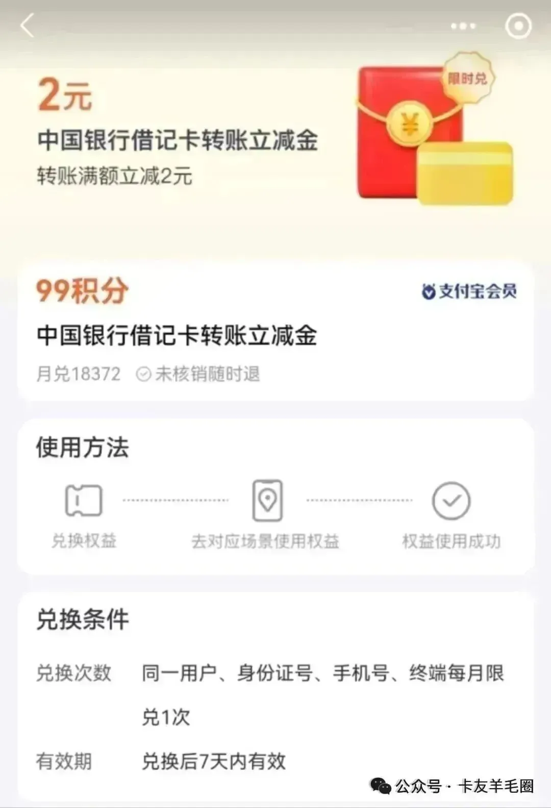 活动时间:2026年3月1日至2026年3月31日活动内容:用支付宝99积分兑换中国银行借记卡转账立减金,且单笔转账金额大于等于2000元时方可抵扣使用;限用户通过支付宝APP内向他人支付宝账户转账使用;活动路径;支付宝APP-我的-支付宝会员-搜中国银行-99积分兑2元立减金