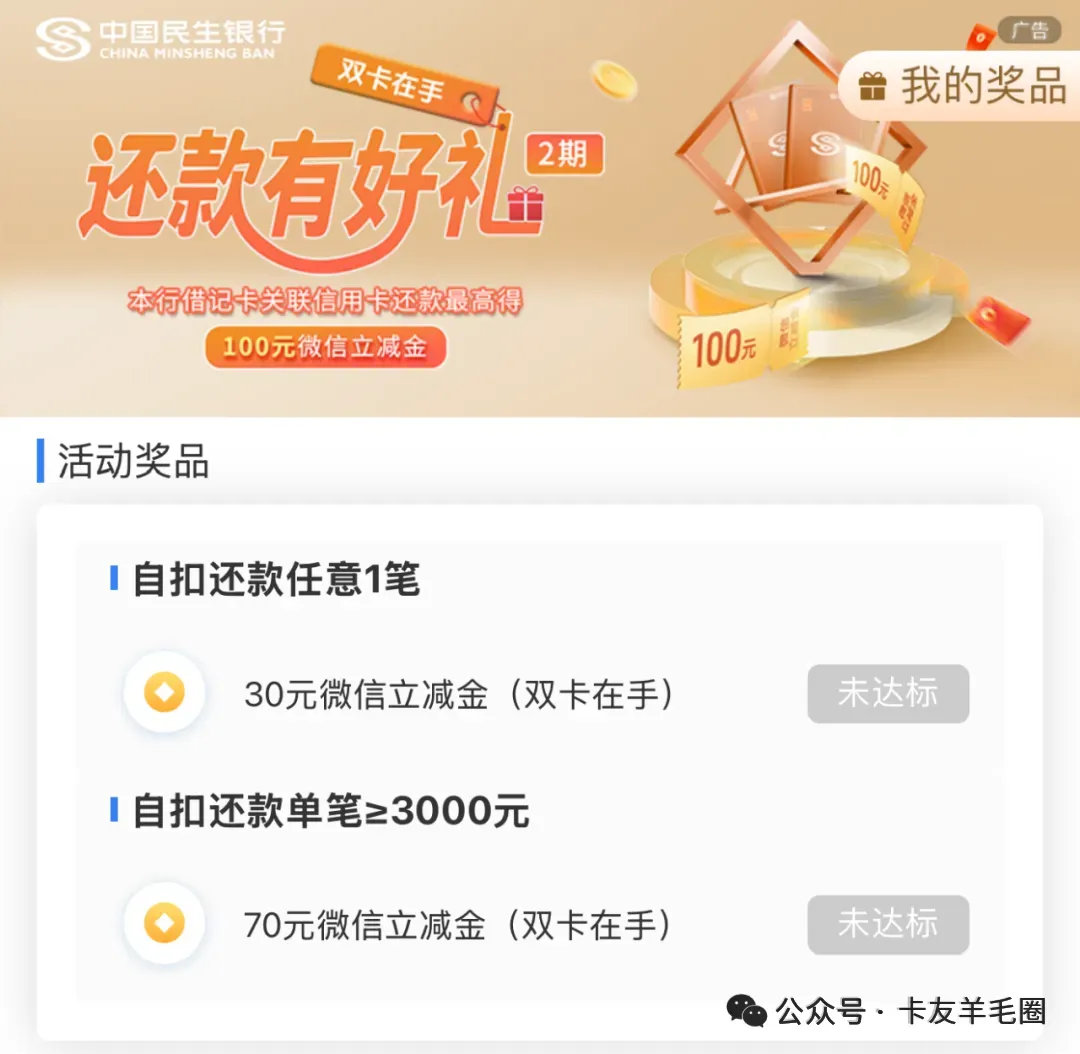 活动内容:活动参与时间内,符合活动对象要求的客户,首次签约信用卡借记卡关联自动还款,完成自动还款交易并达标,最高可领取100元微信立减金(30+70)。活动期间奖品限量120000个,每个客户在活动期间仅可参与一次。数量有限,先到先得。