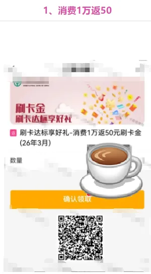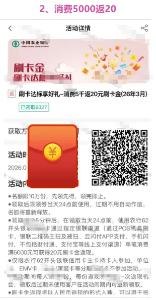 农行银联渠道消费1w返50、消费5k返20。