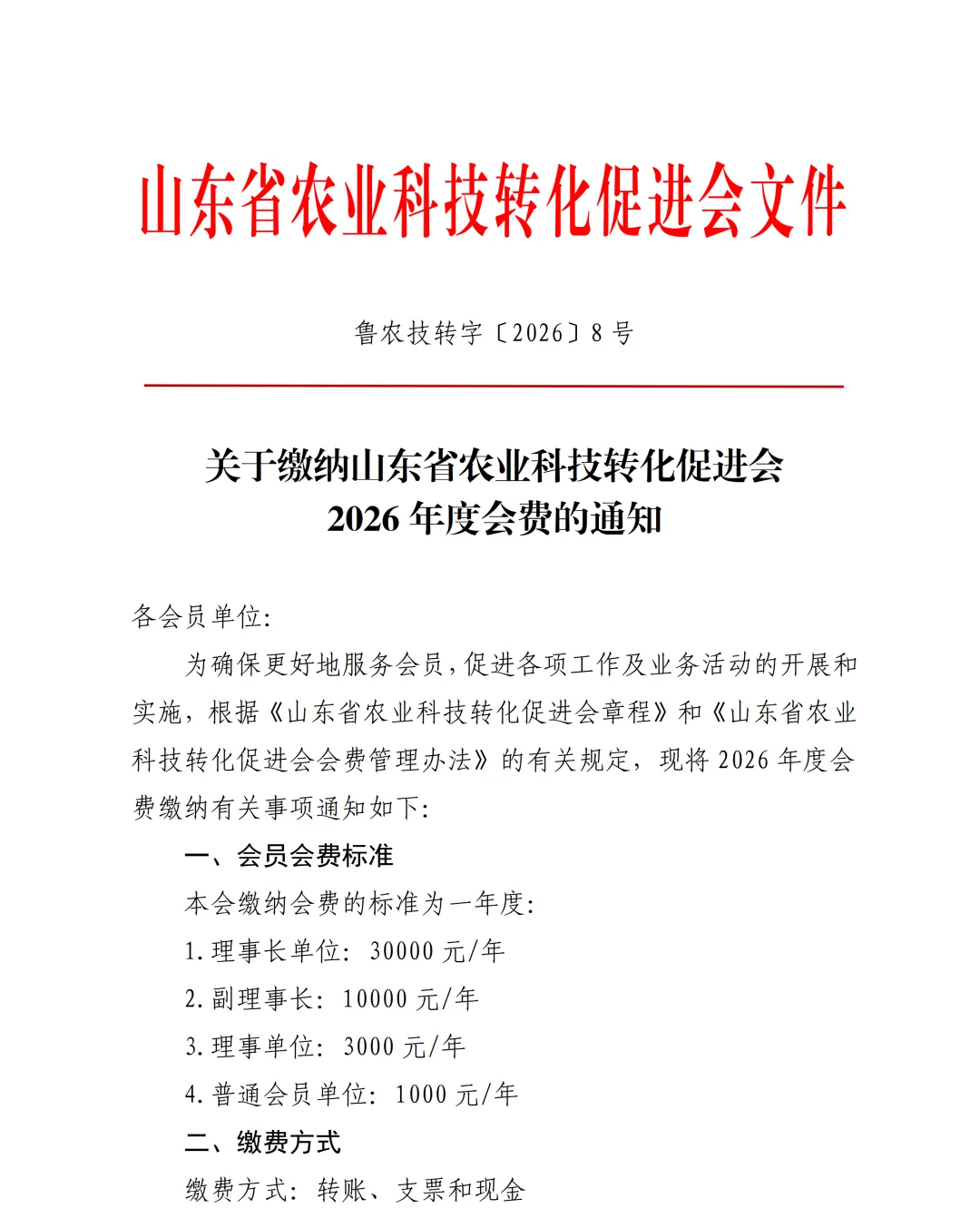 为确保更好地服务会员,促进各项工作及业务活动的开展和实施,根据《山东省农业科技转化促进会章程》和《山东省农业科技转化促进会会费管理办法》的有关规定,现将2026年度会费缴纳有关事项通知如下: