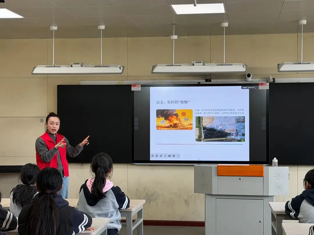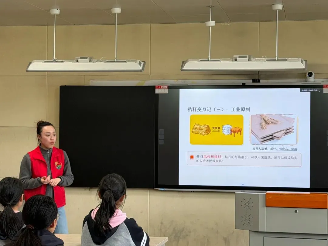 课堂从认识秸秆开始,王老师引导学生结合生活实际,交流身边常见的秸秆种类,在认知中拉近与土地的距离。围绕秸秆过量带来的处理难题,孩子们在互动讨论中,逐渐看见随意处置背后的环境之痛。随后,课堂聚焦秸秆的资源化利用,让“变废为宝”的理念落地生根:秸秆可作饲料、肥料,可成纸张、建材,可制沼气新能源,亦可化身为精美的工艺品——在劳动与创意的交汇处,秸秆完成了从“废弃物”到“宝藏”的转身。