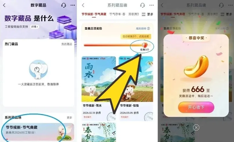 集齐了“雨水、惊蛰、春分”三个数字藏品的伙伴,可以去抽取666~20.6万工银i豆。