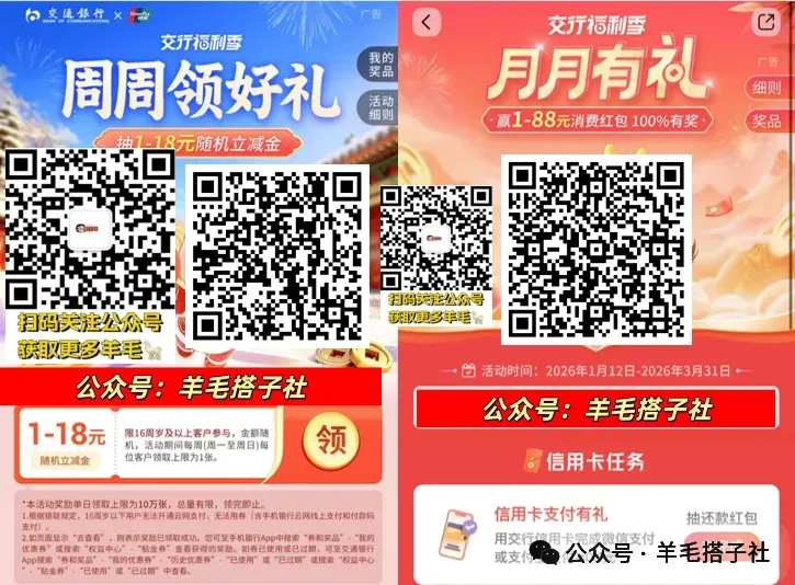 路径:交行App--搜“交行福利季”--周周领好礼,下方扫码
