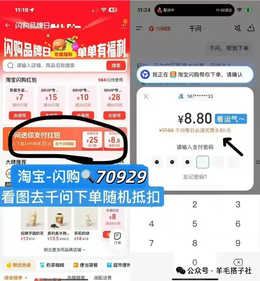 1️⃣ 先去淘宝闪购APP搜索 【70929】 或 【55331】 领取外卖红包2️⃣ 再打开千问APP下单,付款时就会自动叠加立减!