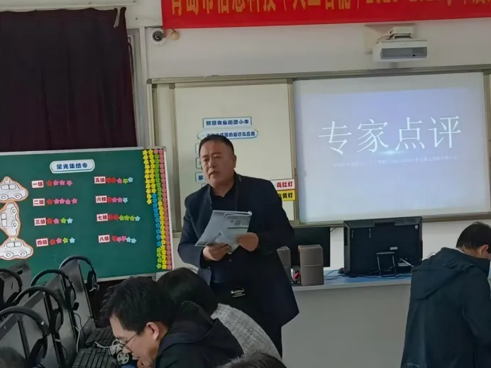 胶州市信息科技教研员范连杰老师作专家点评。范老师高度肯定了本节课探究式学习设计的清晰性,认为其思维建模过程从数据采集、分析判断到执行响应,环环相扣,助力学生完成了从连续数据到离散等级的抽象建模。同时,范老师提出情境创设可更加聚焦,如从自动化大棚或阳台植物养护切入,让学生更易产生代入感,为与会教师提供了专业指导。