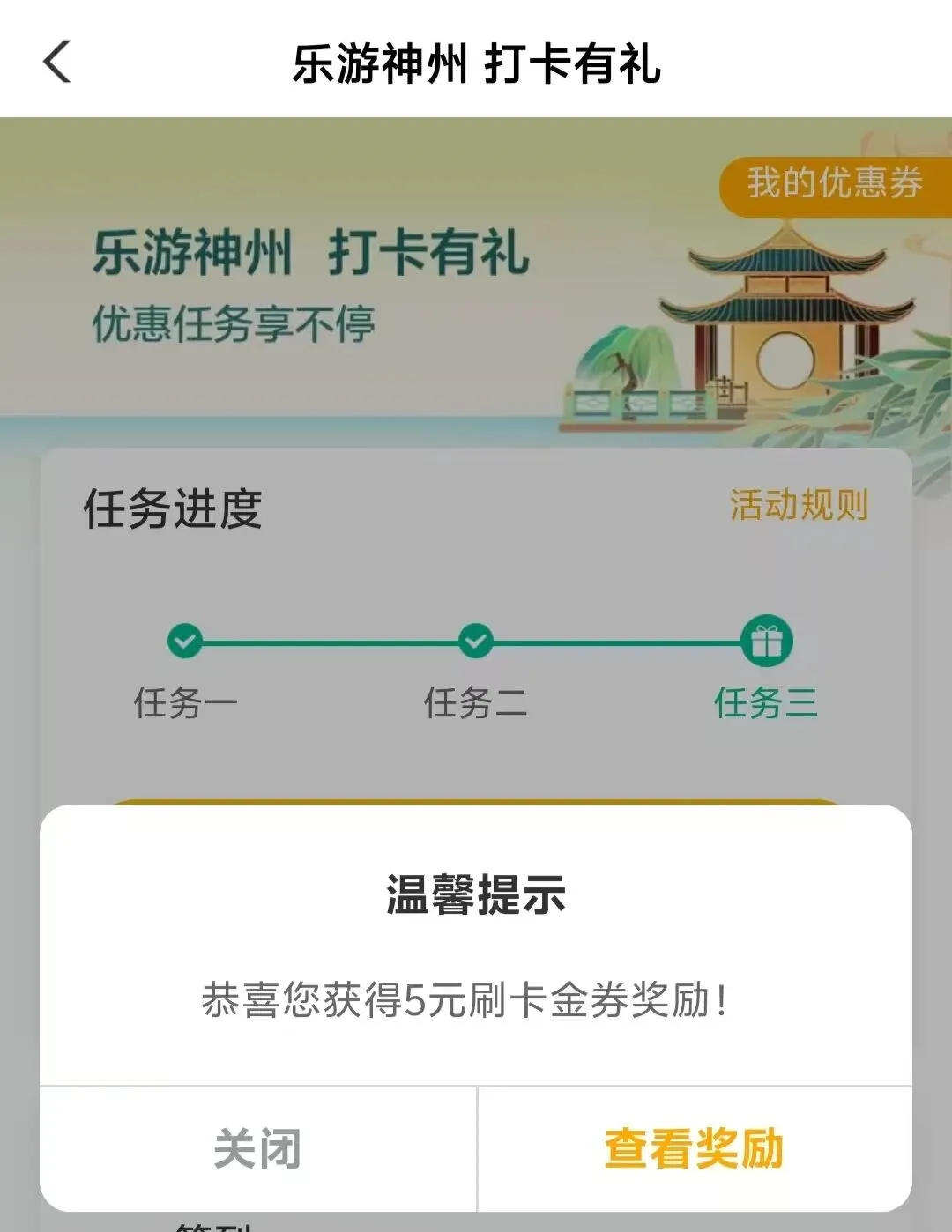 农行APP-信用卡-农行旅游节-打卡,5元刷卡金。