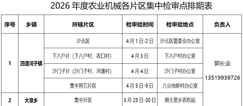 ,2026年农业机械集中检审验工作将在各乡镇陆续开展,检审时间持续至