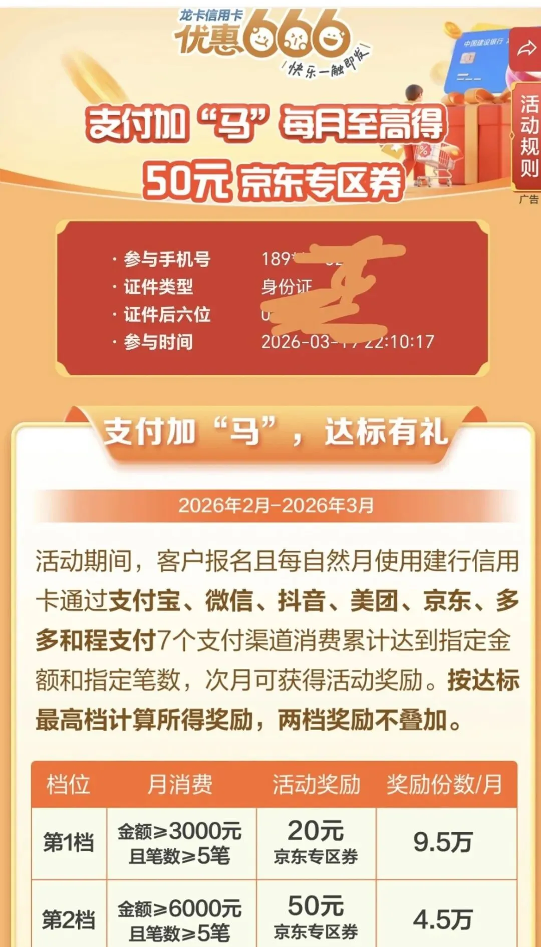 - 6000元档:累计消费≥6000元+≥5笔 → 次月得50元京东专区券(月限4.5万份)