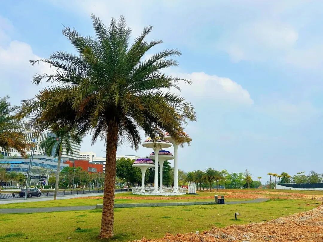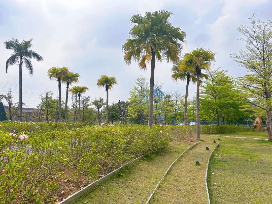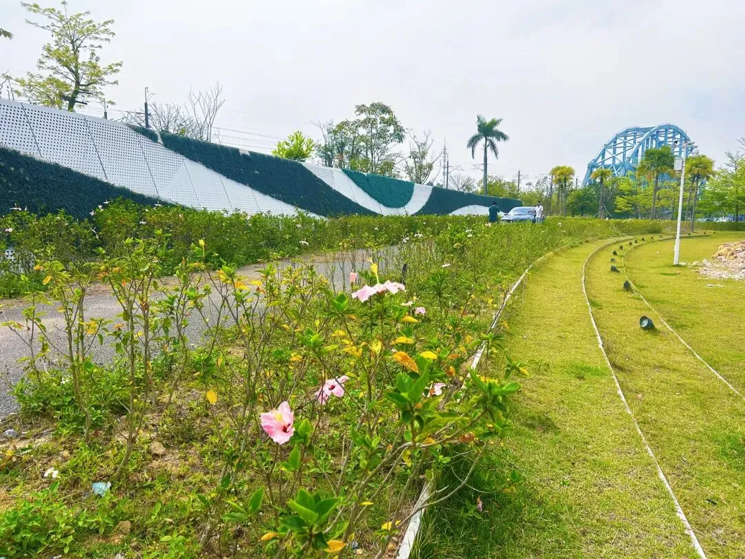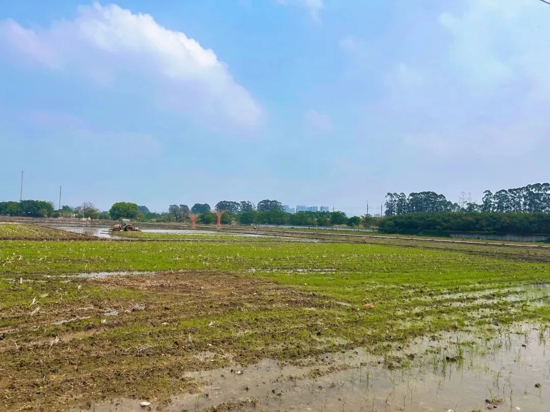 绿色墙围之下的梯田上覆满了青青芳草,扶桑花丛成为粉红色的边界线,在这片靠近路边的地带,没有种植庄稼,倒是树影婆婆的热带槟榔和衫树林引人入胜。难怪树影丛中不时闪现一两个身着艳丽奇装的小网红,甚至有两位帅哥把一台崭新的摩托推进场内,进行现场直播带货。不远处凌驾天际的铁路桥闪耀着湖蓝色的光芒,每逢傍晚,在夕阳余晖的衬托下,一列飞驰而过的绿皮火车带着年代感的浪漫穿行在春天的田野上。这就是为什么那么多摄影爱好者喜欢光顾这里。走遍这些酷似宫崎骏画面的景色,你肯定想见识一下这里的农业主体。就在进入夏良横路的拐角处,一片生机盎然的水稻田呈现眼前。拖拉机在田间忙碌春耕的景象让城市孩子格外兴奋,这也是如今不同寻常的遛娃方式,何况家长不需要带孩子远赴偏僻乡村,在广州新城区范围内就实现了近距离观赏农业生产。交通贴士: