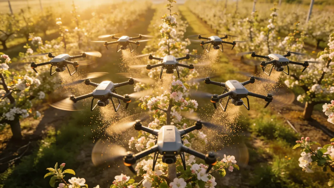 本周发布的“蜂群无人机群”,更是展现了农业智能制造的极限:100台无人机像鸟群一样协同交织飞行,精准定位每一棵果树,在两小时内完成了一座山的果林授粉。这样的效率,是人工授粉的千倍以上,不仅节省了大量人力成本,更避免了人工授粉的误差,提升了果实坐果率。