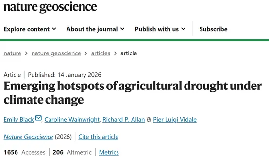 Black, E., et al. Emerging hotspots of agricultural drought under climate change. Nature Geoscience. (2026).